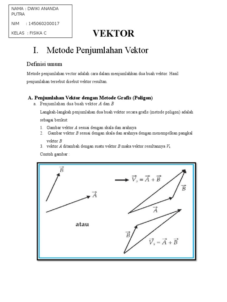 Penjumlahan vektor secara geometri Penjumlahan dua vektor atau lebih secara geomrtri dapat dilakukan dengan dua cara yaitu dengan aturan segitiga dan aturan jajargenjang. Seperti yang telah dijelaskan sebelumnya metode grafis ada tiga jenis yaitu metode segitiga metode poligon dan metode jajarangenjang. Besaran vektor adalah besaran yang memiliki nilai dan arah.