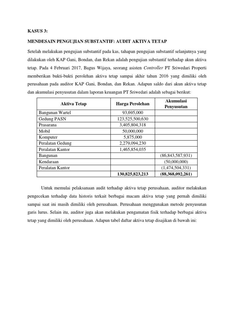 STUDI KASUS Aset Tidak Berwujud. Materi Kuliah Aktiva Tetap. Contoh kasus audit aktiva tetap dan penyelesaiannya akan dimulai dari perencanaan audit dan pemahaman mengenai pengendalian internal perusahaan.